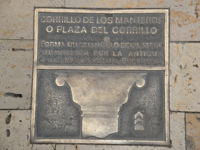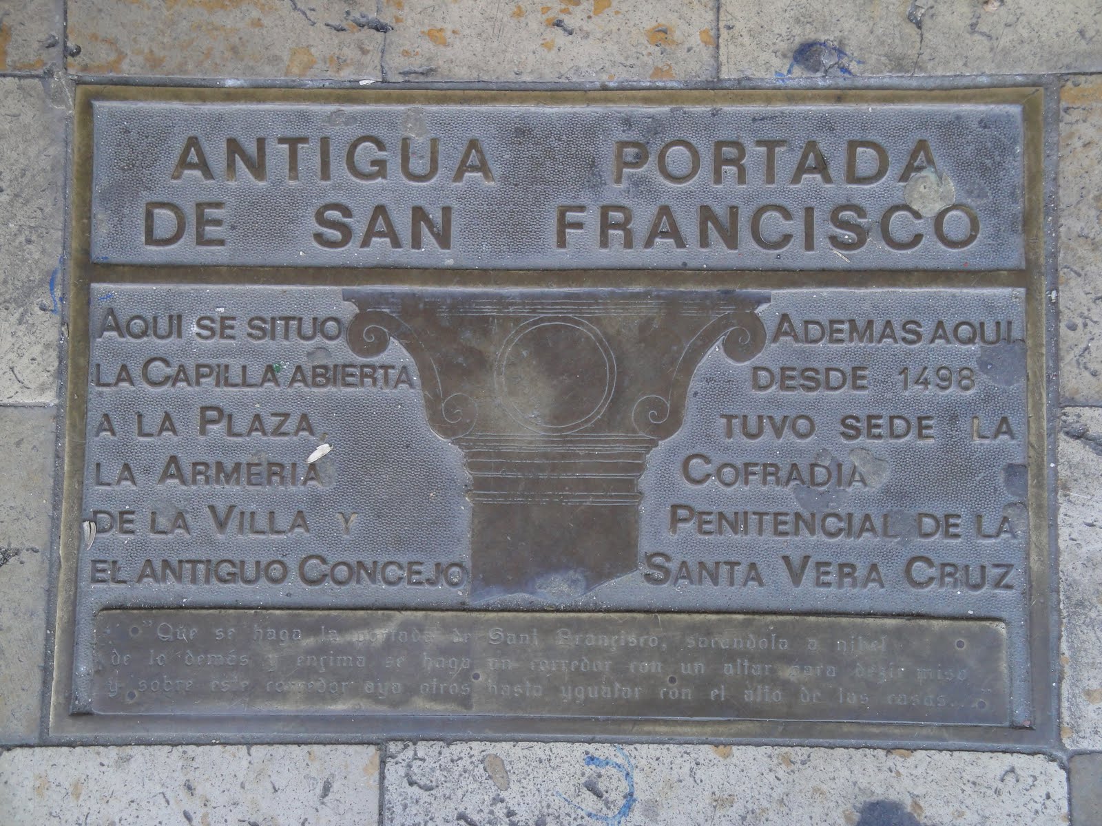 Frente al número 7 y en el suelo se ha montado una de las placas más vergonzosas. La que dice: “Antigua portada de San Francisco. Aquí se situó la capilla abierta a la Plaza, la Armería de la villa y el antiguo concejo. Además aquí desde 1498 tuvo sede la cofradía penitencial de la Santa Vera Cruz”. Debajo de esto, en una cartela inferior puede leerse un fragmento del acuerdo al que se llegó (tras el incendio de 1561 que se llevó por delante más de cuatrocientas casas), en el que el Dr. Velasco y el licenciado Vargas con la ayuda, incluso económica, de Felipe II determinaron que se edificaran nuevas calles y casas y en San Francisco “que se haga la portada sacándola a nivel de lo demás y encima se haga un corredor (balcón) con un altar para decir misa y sobre este corredor aya otros hasta ygualar con el alto de las casas”.